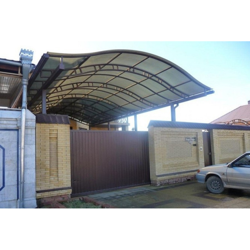 Напіваркова форма - накриття вигнутої форми з примиканням до будинку, така форма навісу чудово виглядає і дає можливість гарному відразу опадів по даху навісу.