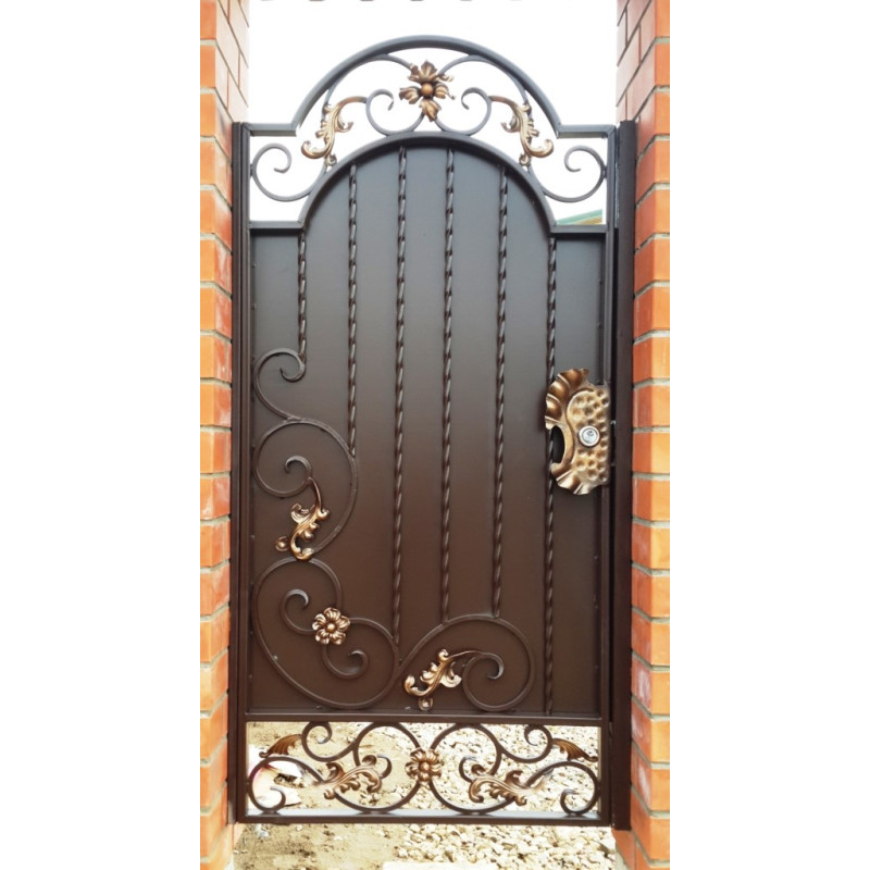 Кована хвіртка розстібна, встановлена між цегляними опорними стовпами, відкрита. На хвіртці встановлені ручка-кільце та врізний замок, закритий кованими накладками.