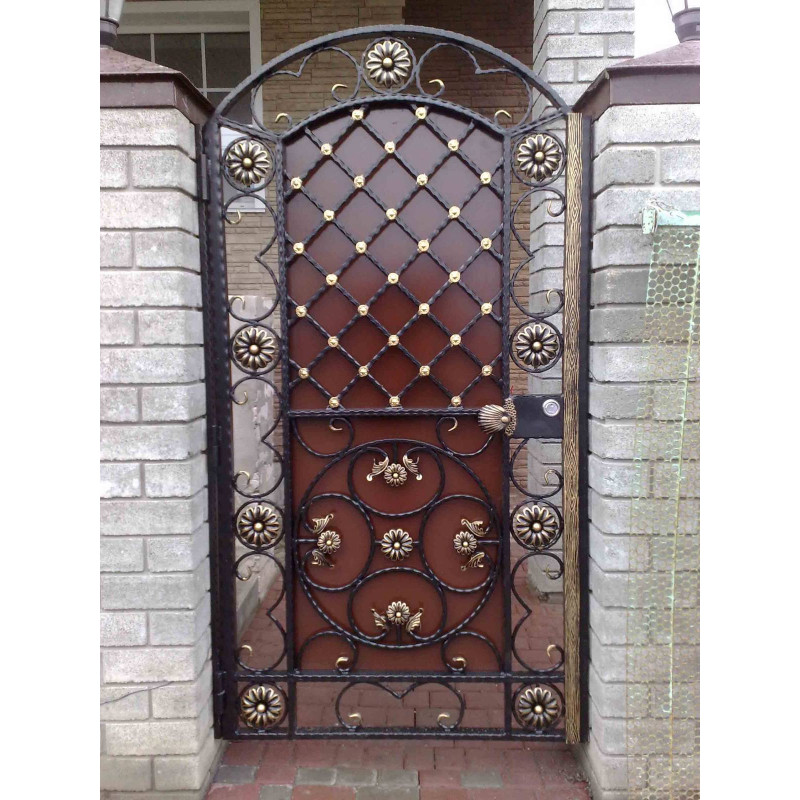 Кована хвіртка розстібна, встановлена між цегляними опорними стовпами, відкрита. На хвіртці встановлені ручка-кільце та врізний замок, закритий кованими накладками.