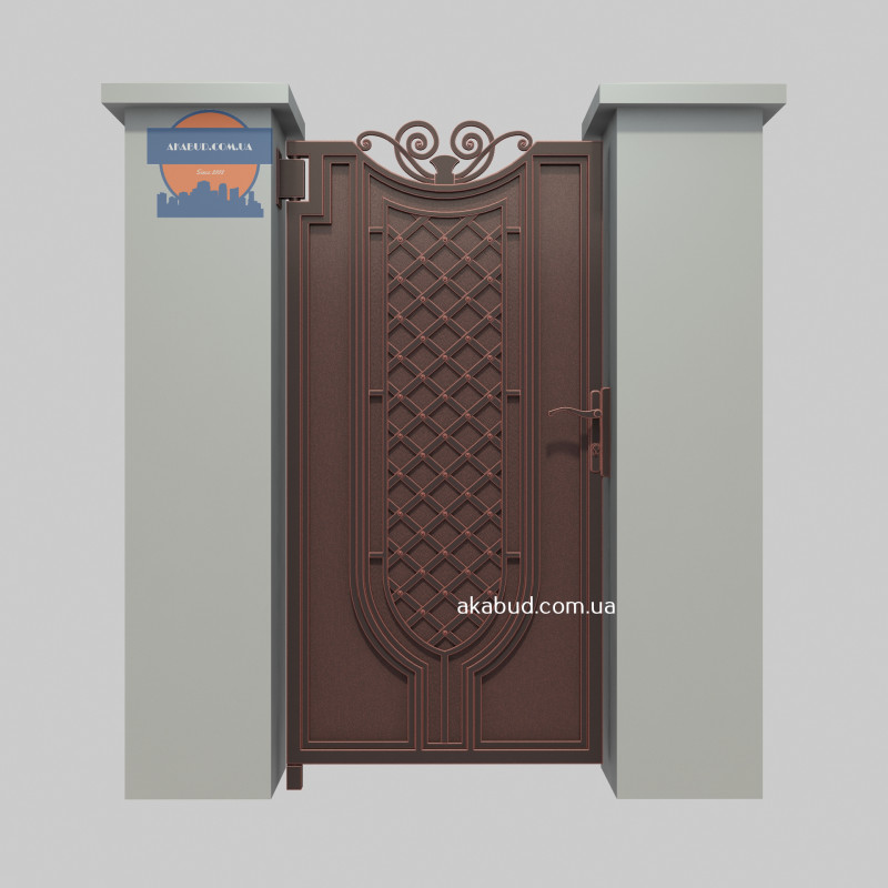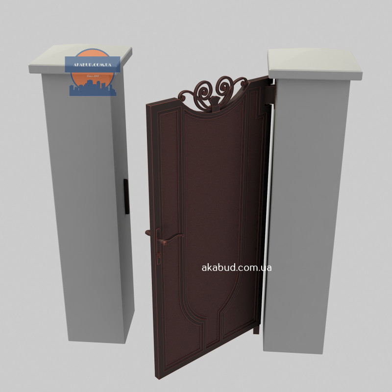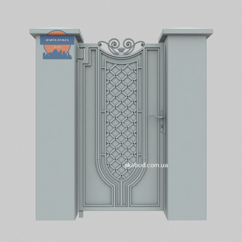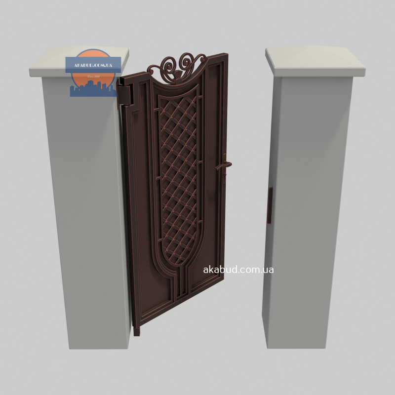 Кована хвіртка розстібна, встановлена між цегляними опорними стовпами, відкрита. На хвіртці встановлені ручка-кільце та врізний замок, закритий кованими накладками.