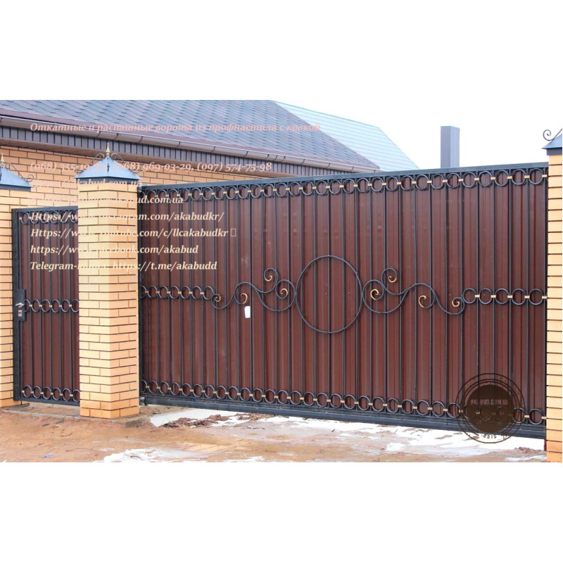 - Відкатні ворота з профнастилом та окремою хвірткою