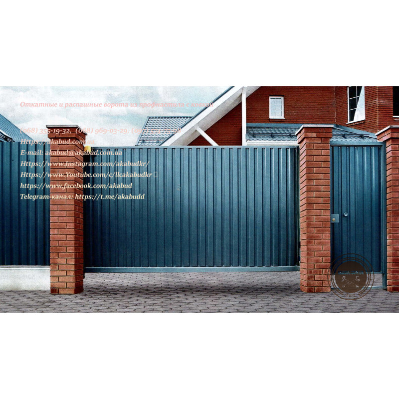 - Відкатні ворота з профлиста з хвірткою